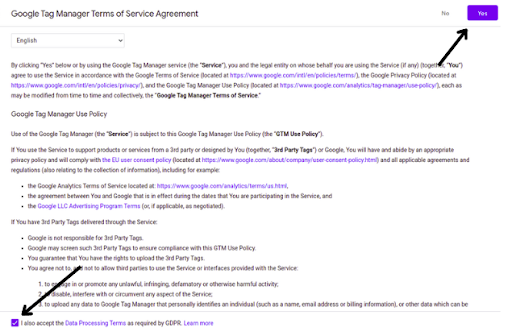 Step-5: A Google Tag Manager Terms of Service window will appear. Check the box, then select “Yes”.