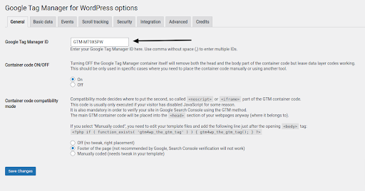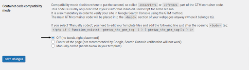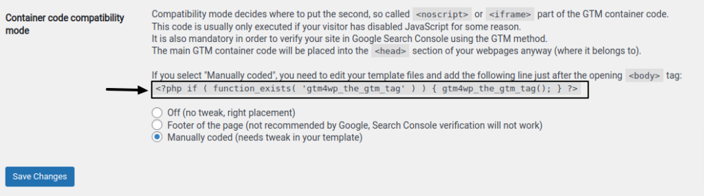 b. Option 2: Manually Encoded – to use this choice, you’ll have to make a minor change to your theme files. You can utilize this option if your WordPress theme lets you make modifications and you’re confident with the theme editor. Click “Save Changes” after selecting the “Custom (requires adjustment in your template)” container code placement.