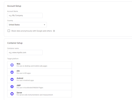 d. Target platform — Indicate where Google Tag Manager will be added (e.g. on your website, mobile, etc)